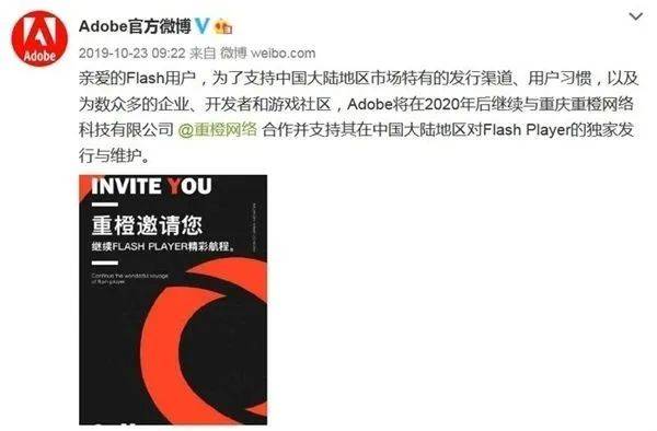 然而,Adobe 同时在新浪微博上表示,Adobe 将会继续与重橙网络合作并支持其在中国大陆地区对 Flash Player 的独家发行与维护,该合作仅限中国大陆地区。换言之,Flash Player 特别为中国制作了一个“特供版”。